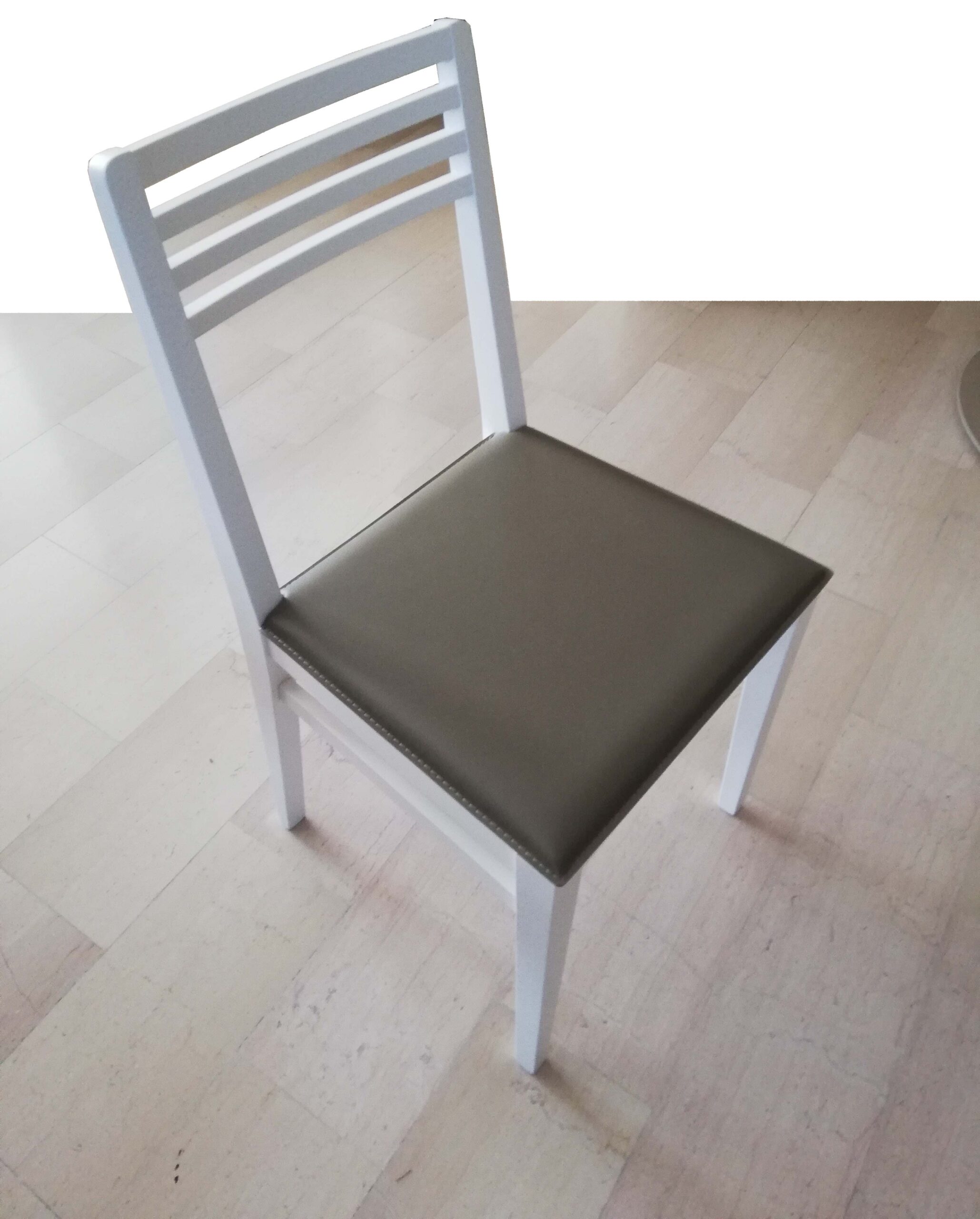Sedia in stile moderno, struttura in legno colore bianco a poro aperto con seduta imbottita rivestita in cuoio colore fango